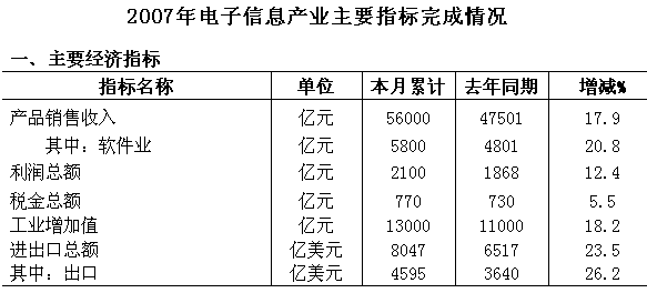 2007年,電子信息全行業(yè)在黨中央、國(guó)務(wù)院的正確領(lǐng)導(dǎo)下,堅(jiān)持以科學(xué)發(fā)展觀為指導(dǎo),認(rèn)真貫徹落實(shí)國(guó)家戰(zhàn)略部署和宏觀調(diào)控措施,積極應(yīng)對(duì)技術(shù)業(yè)務(wù)轉(zhuǎn)型升級(jí)和宏觀政策環(huán)境變化的新形勢(shì),不斷推動(dòng)結(jié)構(gòu)調(diào)整和自主創(chuàng)新,積極拓展國(guó)內(nèi)外市場(chǎng),使產(chǎn)業(yè)經(jīng)濟(jì)運(yùn)行呈現(xiàn)平穩(wěn)發(fā)展態(tài)勢(shì),為國(guó)民經(jīng)濟(jì)和社會(huì)發(fā)展做出了新的貢獻(xiàn)。