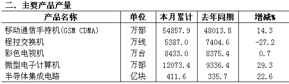 。ㄒ唬┊a(chǎn)業(yè)規(guī)模不斷擴(kuò)大 全年實(shí)現(xiàn)銷售收入5.6萬億元,增長(zhǎng)18%;增加值13000億元,增長(zhǎng)18.2%;軟件業(yè)務(wù)收入5800億元,增長(zhǎng)20.8%。產(chǎn)業(yè)規(guī)模繼續(xù)在國(guó)民經(jīng)濟(jì)各行業(yè)中位居領(lǐng)先,銷售收入占全國(guó)工業(yè)的比重為12%,增加值占全國(guó)GDP的比重達(dá)5.27%。 。ǘ┙(jīng)濟(jì)效益穩(wěn)步提高 進(jìn)入二季度后,全行業(yè)經(jīng)濟(jì)效益開始扭轉(zhuǎn)負(fù)增長(zhǎng)的局面,至12月底實(shí)現(xiàn)利稅2870億元。其中實(shí)現(xiàn)利潤(rùn)2100億元,增長(zhǎng)12.4%;稅收770億元,增長(zhǎng)5.5%;二者增速比上半年提高2個(gè)百分點(diǎn)以上。計(jì)算機(jī)、家用視聽設(shè)備和電子器件行業(yè)效益情況較好,利潤(rùn)增速達(dá)20%以上,成為拉動(dòng)全行業(yè)效益增長(zhǎng)的主要力量。 。ㄈ┊a(chǎn)品產(chǎn)銷銜接良好 多數(shù)重點(diǎn)產(chǎn)品產(chǎn)量保持平穩(wěn)增長(zhǎng),全年生產(chǎn)手機(jī)5.48億部,增長(zhǎng)14%;微型計(jì)算機(jī)1.21億臺(tái),增長(zhǎng)29%;數(shù)碼相機(jī)7493.5萬臺(tái),增長(zhǎng)11.9%;集成電路產(chǎn)量412億塊,增長(zhǎng)22.6%;彩色電視機(jī)8433萬臺(tái),增長(zhǎng)0.7%。產(chǎn)品產(chǎn)銷銜接良好,手機(jī)、計(jì)算機(jī)、彩電等主要產(chǎn)品產(chǎn)銷率均達(dá)98%以上。全行業(yè)產(chǎn)品庫(kù)存慢于收入增長(zhǎng),增速為17%,比收入增速低了1個(gè)百分點(diǎn)。 。ㄋ模⿲(duì)外貿(mào)易增勢(shì)平穩(wěn) 全行業(yè)對(duì)外貿(mào)易額達(dá)到8047億美元,同比增長(zhǎng)23.5%,占全國(guó)外貿(mào)總額的37%。出口4595億美元,增長(zhǎng)26.2%,增速比全國(guó)出口高了0.5個(gè)百分點(diǎn),占全國(guó)出口總額的比重為37.7%。進(jìn)口3452億美元,增長(zhǎng)20%,占全國(guó)進(jìn)口總額的比重為36.1%。出口較快的主要是計(jì)算機(jī)和電子元件行業(yè),二者增速分別比全行業(yè)高了2.8和10.8個(gè)百分點(diǎn)。 。ㄎ澹┕潭ㄙY產(chǎn)投資繼續(xù)擴(kuò)大 全行業(yè)500萬元以上投資項(xiàng)目累計(jì)完成投資2646億元,同比增長(zhǎng)27.9%;本年新增固定資產(chǎn)1477億元,增長(zhǎng)9.2%。本年新開工項(xiàng)目2780個(gè),同比增長(zhǎng)10.2%;新開工項(xiàng)目的計(jì)劃投資總額為2303億元,增長(zhǎng)34.9%;新開工項(xiàng)目主要來自電子元器件領(lǐng)域,二者新開工項(xiàng)目超過1300項(xiàng),占全行業(yè)的一半左右。 (六)企業(yè)實(shí)力不斷增強(qiáng) 全行業(yè)規(guī)模以上企業(yè)共有27569家,其中制造業(yè)14601家,軟件業(yè)12968家。企業(yè)經(jīng)濟(jì)規(guī)模不斷擴(kuò)大,全年電子信息百?gòu)?qiáng)企業(yè)完成營(yíng)業(yè)收入超過1萬億元,實(shí)現(xiàn)利稅超過500億元,出口交貨值增長(zhǎng)20%以上,日益成為推動(dòng)行業(yè)平穩(wěn)運(yùn)行的中堅(jiān)力量。 。ㄆ撸┛萍紕(chuàng)新日趨深入 新品開發(fā)穩(wěn)步增長(zhǎng),全行業(yè)新品產(chǎn)值率超過20%,比上年提高了0.2個(gè)百分點(diǎn)。企業(yè)研發(fā)投入不斷提高,全行業(yè)研發(fā)投入超過1000億元,電子信息百?gòu)?qiáng)企業(yè)研發(fā)投入占銷售收入比重接近4%,其中有11家企業(yè)比例已超過6%,海爾、華為等研發(fā)投入均超過50億元。 。ò耍﹨^(qū)域布局日益集中 九個(gè)國(guó)家信息產(chǎn)業(yè)基地實(shí)現(xiàn)收入超過3萬億元,成為引領(lǐng)產(chǎn)業(yè)增長(zhǎng)的重要地區(qū),并在結(jié)構(gòu)調(diào)整、技術(shù)創(chuàng)新、產(chǎn)業(yè)配套、外貿(mào)出口、人才就業(yè)等方面發(fā)揮重要的帶動(dòng)示范效應(yīng)。40個(gè)國(guó)家電子信息產(chǎn)業(yè)園,分別在通信、計(jì)算機(jī)、家電、集成電路、電子元件、電子器件、電子材料等專業(yè)領(lǐng)域處于全國(guó)領(lǐng)先地位,合計(jì)產(chǎn)業(yè)規(guī)模占全國(guó)的1/4以上。 (九)能源消耗處于較低水平 全年規(guī)模以上制造業(yè)消耗標(biāo)準(zhǔn)煤1476萬噸,每萬元增加值消耗標(biāo)準(zhǔn)煤0.164噸,比上年下降1.2%,約等于國(guó)民經(jīng)濟(jì)和工業(yè)平均水平的15%和7%。其中能耗排在前面的小行業(yè)分別是電子真空器件(1.13噸)、電光源(0.61噸)、印制電路板(0.38噸)、信息化學(xué)材料(0.37噸)、光纖光纜(0.36噸)。從能源產(chǎn)品看,電力、原煤、燃料油、柴油占據(jù)前四位,分別占全行業(yè)能源消耗量的49%、15%、11%、10%。 (十)信息化程度進(jìn)一步提高 全國(guó)手機(jī)普及率達(dá)到41.6%,比上年增加了6.3個(gè)百分點(diǎn);互聯(lián)網(wǎng)用戶達(dá)到2.1億人,比上年增長(zhǎng)7000萬人以上;城鎮(zhèn)居民計(jì)算機(jī)擁有量達(dá)到59.7臺(tái)/百戶,彩電擁有量超過151臺(tái)/百戶,二者分別比上年提高了15%和5%。國(guó)家信息化投資占城市基礎(chǔ)設(shè)施投資的比重接近10%,電子政務(wù)投入在電信建設(shè)投入的比重為12%。企業(yè)電子商務(wù)不斷推進(jìn),電子大中型企業(yè)電子商務(wù)采購(gòu)、銷售額占營(yíng)業(yè)額的比重達(dá)40%。 (十一)從業(yè)人數(shù)不斷增加 全年規(guī)模以上電子信息產(chǎn)業(yè)就業(yè)人數(shù)達(dá)到777萬人,其中制造業(yè)675萬人,軟件業(yè)102萬人;二者合計(jì)