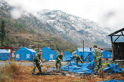云南省怒江傈僳族自治州近日遭遇嚴(yán)重雪災(zāi)。云南邊防總隊(duì)派出由1600余名官兵組成的搶險救災(zāi)突擊隊(duì),參加搶險救災(zāi)。圖為官兵為災(zāi)民搭建帳篷。
