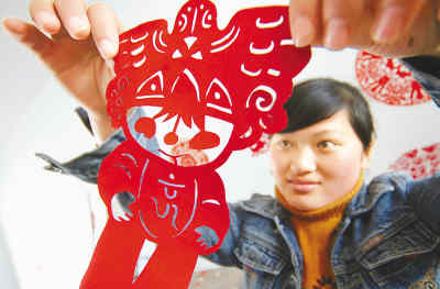3月3日,一名聾啞學(xué)生展示奧運(yùn)題材的剪紙作品。