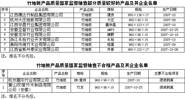 為了保障消費者的合法權(quán)益,促進竹地板行業(yè)健康發(fā)展,國家質(zhì)檢總局組織對竹地板產(chǎn)品質(zhì)量進行了國家監(jiān)督抽查,共抽查了浙江、安徽、湖南、江西等4個省50家企業(yè)生產(chǎn)的50種產(chǎn)品(不涉及出口產(chǎn)品),產(chǎn)品實物質(zhì)量抽樣合格率為94.2%。