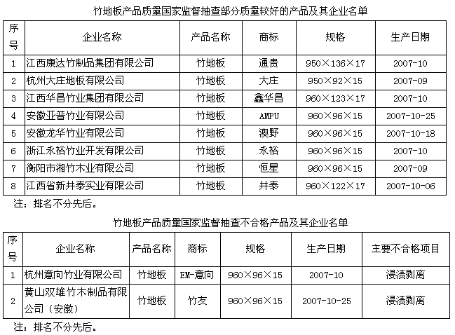 為了保障消費(fèi)者的合法權(quán)益,促進(jìn)竹地板行業(yè)健康發(fā)展,國家質(zhì)檢總局組織對(duì)竹地板產(chǎn)品質(zhì)量進(jìn)行了國家監(jiān)督抽查,共抽查了浙江、安徽、湖南、江西等4個(gè)省50家企業(yè)生產(chǎn)的50種產(chǎn)品(不涉及出口產(chǎn)品),產(chǎn)品實(shí)物質(zhì)量抽樣合格率為94.2%。