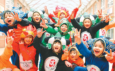 3月21日,“奧運志愿心樂團”來到北京市崇文小學,與孩子們一起喜迎圣火,熱盼奧運。圖為由孩子們組成的福娃造型輪滑隊表演《來吧2008》。