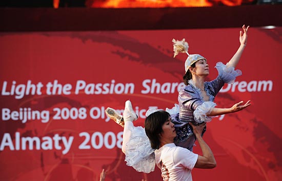 4月1日,參加火炬接力城市慶典活動的演員在進行排練。當日,北京奧運會圣火到達全球傳遞的第一站——阿拉木圖。