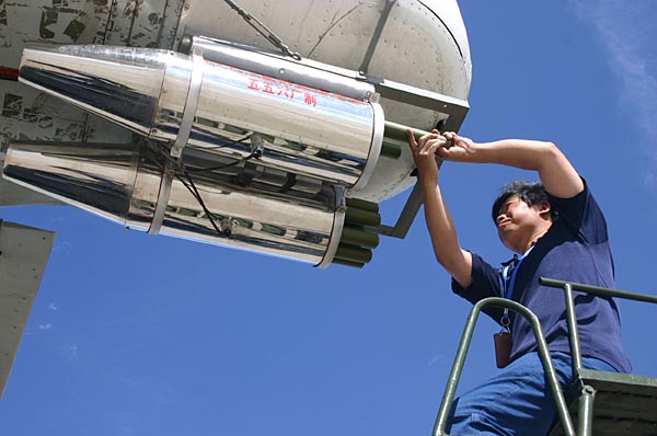 圖為2007年8月8日,工作人員為“運(yùn)8”飛機(jī)安裝催化材料。為保障2008年奧運(yùn)會開、閉幕式順利舉行,北京、內(nèi)蒙古氣象部門于2007年8月8日至9日聯(lián)合在呼和浩特進(jìn)行2008年奧運(yùn)會“消云減雨”演練。(資料照片) |