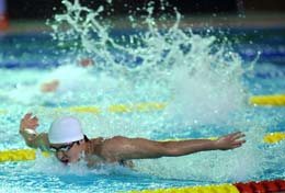2008年全國游泳冠軍賽暨奧運選拔賽上,吳鵬在男子100米蝶泳預(yù)賽中。新華社記者:徐昱