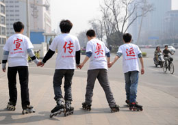 山西省太原理工大學(xué)輪滑協(xié)會(huì)的20多名隊(duì)員穿上旱冰鞋和自制的文化衫開展奧運(yùn)宣傳活動(dòng),表達(dá)對(duì)北京奧運(yùn)會(huì)的祝福。