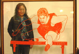 “中國人的驕傲”剪紙藝術(shù)巡展首站在香港中央圖書館啟動(dòng),展出近200幅以奧運(yùn)為主題的剪紙作品。圖為“中國人的驕傲——永恒瞬間”創(chuàng)作人盧雪和她的作品《劉翔》合影。 |