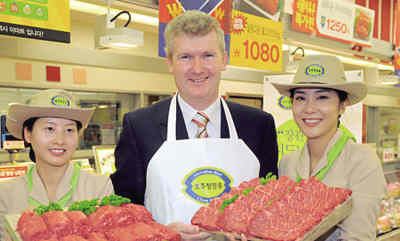 澳大利亞農(nóng)業(yè)部長(zhǎng)伯克日前抵達(dá)韓國(guó),推動(dòng)進(jìn)一步的雙邊貿(mào)易和推廣澳大利亞農(nóng)產(chǎn)品。圖為伯克(中)在韓國(guó)首爾一家零售店推銷澳大利亞產(chǎn)牛肉。新華社/法新