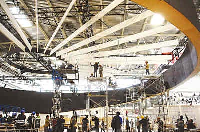 2008(第十屆)北京國際汽車展覽會(huì)將于4月22日在北京中國國際展覽中心舉行。本屆車展將有225家海外廠商和1800余家國內(nèi)廠商參展。圖為14日北京新國展中心,工作人員在一巨大汽車引擎下緊張搭臺(tái)布展。