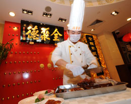 全聚德亞運(yùn)村店的廚師在展示片鴨子的技術(shù)。本報(bào)記者:李鋼