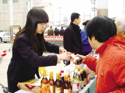 | 寬牌醋技術(shù)人員向消費(fèi)者介紹辨別食醋真假的方法 |
