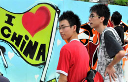 5月1日,青少年在塔石廣場(chǎng)上觀看迎接北京奧運(yùn)會(huì)的“創(chuàng)意涂鴉大比拼”作品。當(dāng)日,中國(guó)澳門(mén)特區(qū)在塔石廣場(chǎng)舉辦“中國(guó)澳門(mén)青年喜迎2008北京奧運(yùn)”活動(dòng),逾萬(wàn)名中學(xué)生及當(dāng)?shù)鼐用駞⑴c到活動(dòng)當(dāng)中。