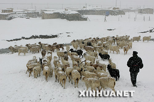 圖為5月7日,新疆哈密牧民在雪中牧羊。