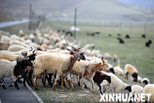 下圖為:5月5日,羊群正在穿越甘肅省甘南藏族自治州夏河縣一條草原公路。 |