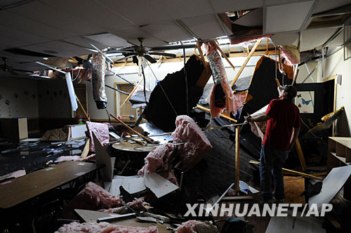 5月10日,在美國阿肯色州本頓維爾,一名男子查看一所學(xué)校受損的屋頂。新華社/美聯(lián) | |