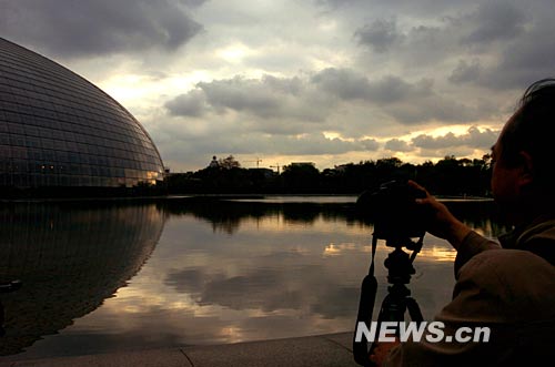 當日,北京出現降雨,雨后初晴,國家大劇院在晚霞的映襯下顯得格外美麗壯觀。