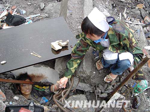 5月13日,一位護士不停地與一位被困孩子說話,鼓勵他等待救援。汶川地震造成四川北川縣老縣城80%、新縣城60%以上建筑垮塌,傷亡人數(shù)目前尚無準確統(tǒng)計。