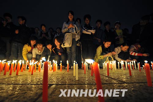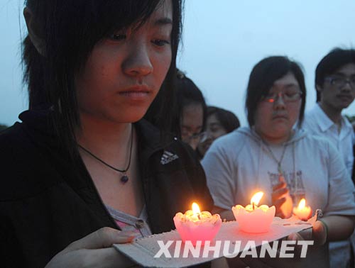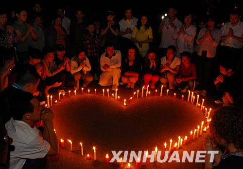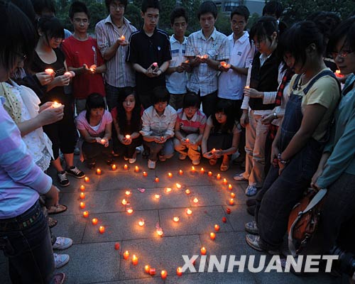 5月14日,學生們手持蠟燭為四川地震災區(qū)祈禱。