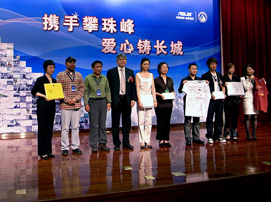 | 5月19日,以“攜手攀珠峰,愛心鑄長城”為主題的“中國登山英雄載譽(yù)歸來暨華碩志愿者凱旋賑災(zāi)媒體見面會(huì)”在北京召開。在珠峰完成火炬?zhèn)鬟f的王勇峰、黃春貴、次落、景陽等四位登山英雄在會(huì)上與媒體見面,并當(dāng)場為四川地震災(zāi)區(qū)舉行義賣捐獻(xiàn)活動(dòng),號(hào)召更多的人和災(zāi)區(qū)同胞并肩攜手,在珠峰精神的感召和鼓舞下,勇敢地抗擊災(zāi)害。 |