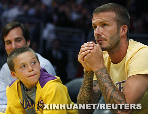5月21日,洛杉磯銀河足球隊(duì)球員貝克漢姆(右)與他的兒子布魯克林在場(chǎng)邊觀看湖人隊(duì)的比賽。