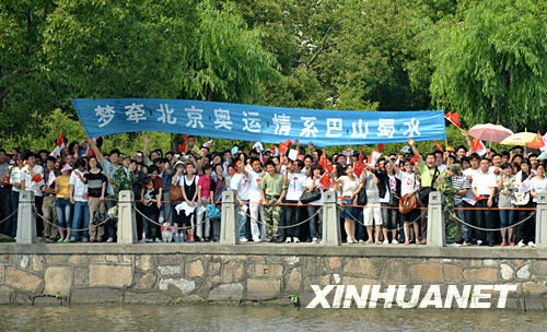 5月22日,群眾在南湖湖畔迎接奧運(yùn)圣火。