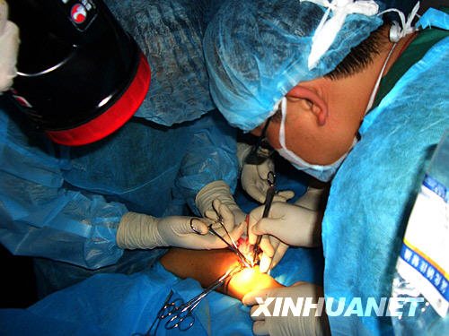 當日下午,地震災區(qū)青川縣木魚鎮(zhèn)轉來因余震骨折傷員。天津抗震醫(yī)療隊接到傷員后與沈陽軍區(qū)抗震野戰(zhàn)醫(yī)院取得聯(lián)系,立即在野戰(zhàn)醫(yī)院帳篷手術室打著手電筒為傷員進行骨科手術。
