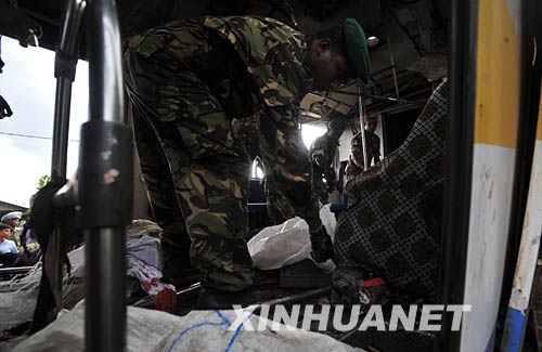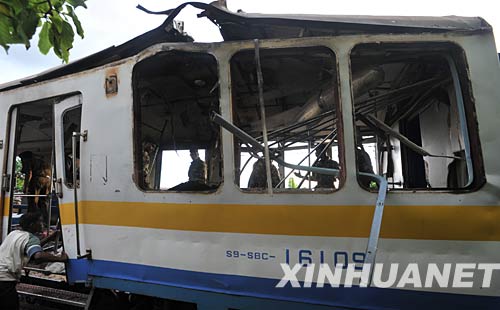 5月26日下午,一列客運火車在駛進(jìn)斯里蘭卡首都科倫坡南郊代希瓦勒火車站時,放置在火車內(nèi)的爆炸物被引爆,造成至少7人死亡,62人受傷。斯軍方認(rèn)為,爆炸是反政府武裝泰米爾伊拉姆猛虎解放組織(猛虎組織)所為。圖為被炸毀的火車車廂。 新華社發(fā)
