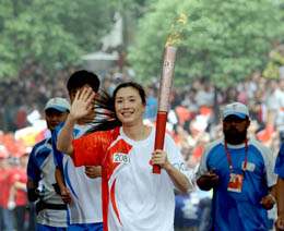 5月27日,最后一棒火炬手、前中國女排隊(duì)員孫玥在進(jìn)行傳遞。當(dāng)日,北京奧運(yùn)會圣火在江蘇南京傳遞。