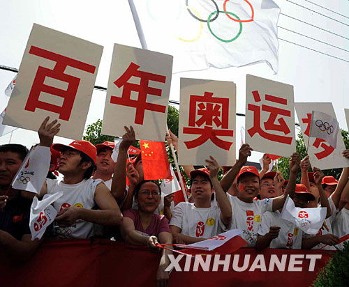 5月29日,淮南市民為奧運圣火傳遞活動加油。