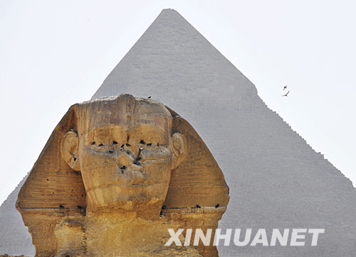 6月1日, 一群鴿子在埃及著名古跡——獅身人面像的頭部筑窩、休息。新華社記者