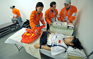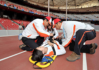 | 志愿者在“鳥巢”內(nèi)進(jìn)行醫(yī)療救護(hù)演練。新華社記者 羅曉光
