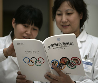 | 兩名醫(yī)務(wù)工作者閱讀首都衛(wèi)生系統(tǒng)奧運(yùn)培訓(xùn)讀本。新華社發(fā)(張傳東