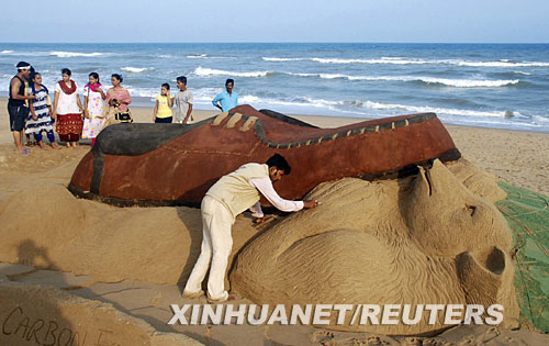 這座沙雕以一只皮鞋踩在北極熊身上為造型,寓意皮革工業(yè)會破壞環(huán)境。帕特奈克是為迎接6月5日世界環(huán)境日而進(jìn)行此項(xiàng)創(chuàng)作的。 新華社/路透