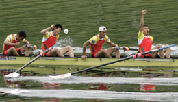 6月1日,中國隊(duì)選手黃鐘鳴、吳崇魁、張林、田軍(從左至右)在賽艇世界杯瑞士盧塞恩站男子輕量級四人單槳決賽中奪得冠軍。新華社/路透 | 5金1銀3銅,這是中國賽艇隊(duì)在2008年第二站世界杯瑞士盧塞恩站的成績。 盡管包括國際賽艇聯(lián)合會官方網(wǎng)站在內(nèi)的外國媒體開始用“powerhouse”(強(qiáng)手、霸主)來形容中國隊(duì),但中國隊(duì)領(lǐng)隊(duì)曹景偉分析說:5枚世界杯金牌說明不了什么。