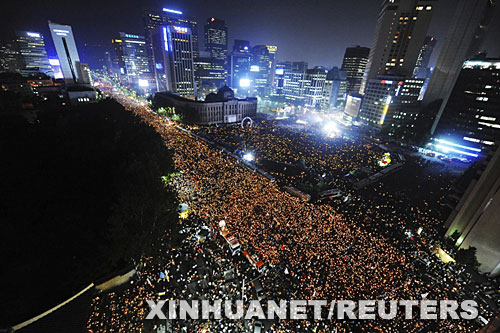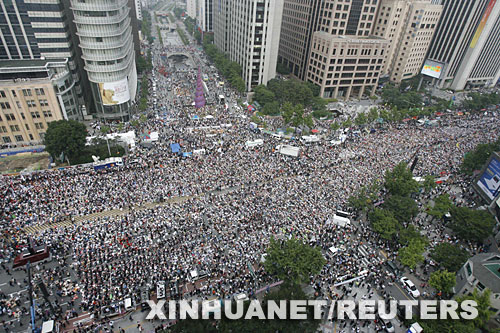 因擔(dān)憂進(jìn)口美國牛肉可能給韓國帶來瘋牛病隱患,約100萬韓國人當(dāng)天走上街頭參加抗議。韓國今年4月與美國達(dá)成開放市場進(jìn)口美國牛肉協(xié)議,但遭到國內(nèi)強(qiáng)烈反對,引發(fā)一系列抗議活動。 新華社/路透