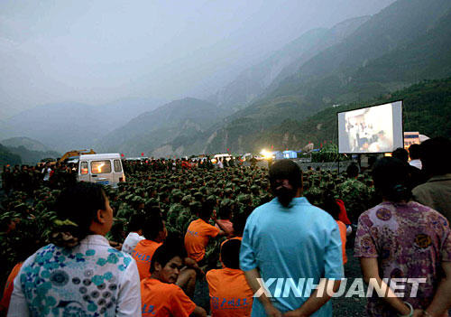 6月12日,阿壩州電影公司來到映秀鎮(zhèn)抗震救災(zāi)營地放映災(zāi)后首場電影,慰問抗震救災(zāi)人員。