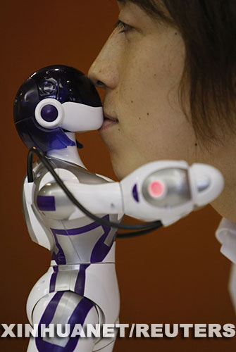 6月16日,日本世嘉玩具公司推出的新型機(jī)器人在東京舉行的展示活動(dòng)上親吻一名男士。