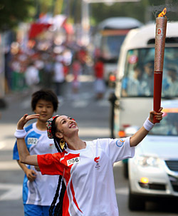 | 6月17日,火炬手阿布都克力木熱娜手持火炬?zhèn)鬟f。當(dāng)日,北京奧運(yùn)圣火在新疆烏魯木齊傳遞。新華社記者 邢廣利