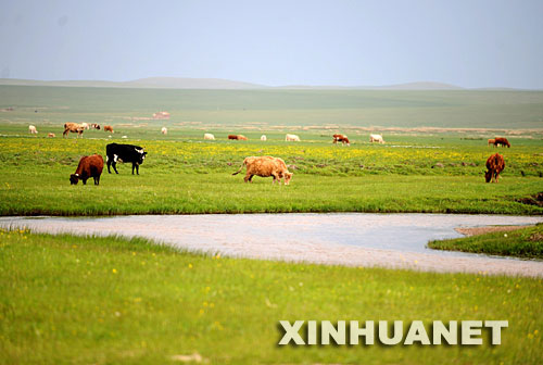 牛羊在西烏珠穆沁旗巴勒嘎爾河邊的草地上吃草(攝于6月22日)。