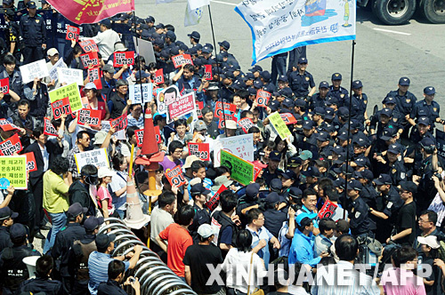 | 6月26日,在韓國釜山,防暴警察與抗議政府恢復(fù)進(jìn)口美國牛肉的民眾對峙。
