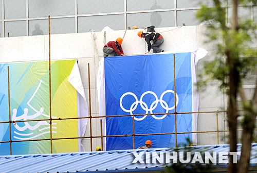 6月26日,兩名工作人員正在裝飾奧帆中心場館外墻。