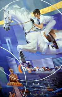 6月29日,繼《喝彩—中國(guó)奧運(yùn)百年圓夢(mèng)》《北京千年城市風(fēng)景畫(huà)》后,澳大利亞著名奧運(yùn)畫(huà)家查爾斯·比利奇又一幅力作《香港—2008》風(fēng)景畫(huà)亮相京城。畫(huà)作高1.2米、寬4.8米,以香港作為2008年奧運(yùn)會(huì)馬術(shù)運(yùn)動(dòng)比賽地為主題。圖為作品局部。