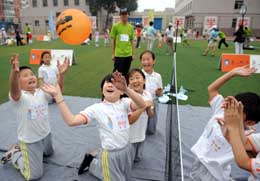 6月28日,社區(qū)小朋友在體驗(yàn)殘奧項(xiàng)目坐式排球運(yùn)動(dòng)。