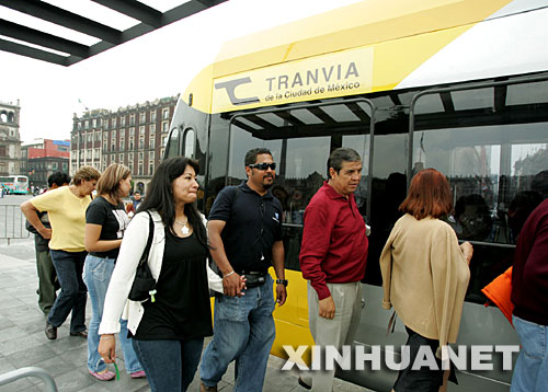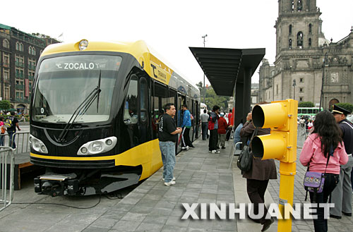 7月5日,墨西哥城聯(lián)邦區(qū)政府在墨西哥城索卡洛廣場展示將于2010年投入運營的新型有軌電車,同時征求市民意見。這種電車可載客300名。