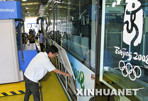 7月6日,一名工人在北京奧運(yùn)村為一輛鋰電池巴士更換電池。 | |