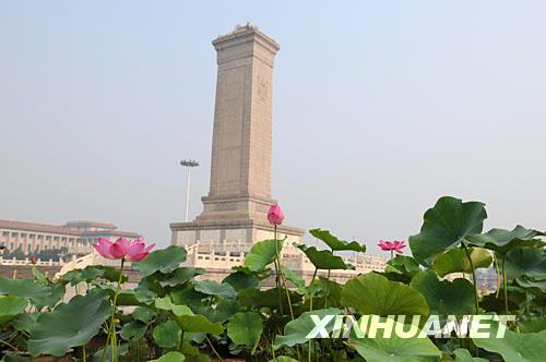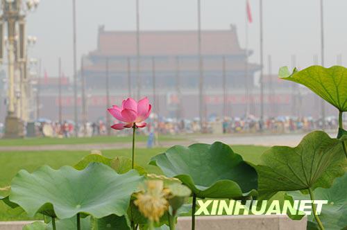 [進(jìn)入北京奧運(yùn)會(huì)專題] 這是7月7日拍攝的北京天安門廣場上盛開的紅蓮。 北京奧運(yùn)會(huì)進(jìn)入倒計(jì)時(shí)一個(gè)月,天安門廣場