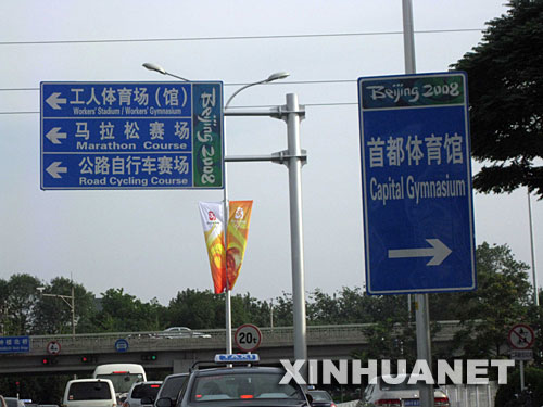 奧運一天天臨近,北京街頭有關(guān)奧運比賽體育館、訓(xùn)練館、飯店等的路標(biāo)越來越多。