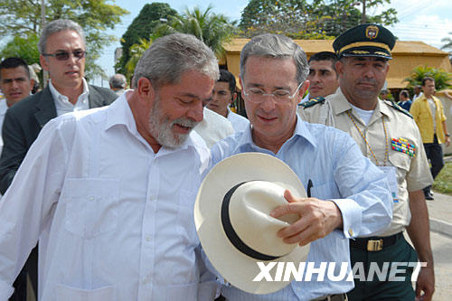 7月20日,在哥倫比亞萊蒂西亞,哥總統(tǒng)烏里韋(前右)和巴西總統(tǒng)盧拉(前左)共同出席慶;顒印.(dāng)天,哥倫比亞舉行閱兵等活動,慶祝獨立198周年。哥總統(tǒng)烏里韋主持閱兵儀式,巴西總統(tǒng)盧拉、秘魯總統(tǒng)加西亞應(yīng)邀出席。