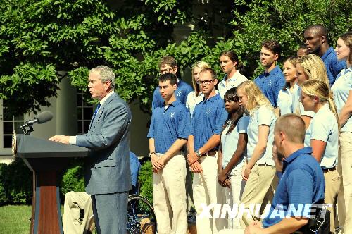 7月21日,美國總統(tǒng)布什在送行儀式上講話。當日,美國總統(tǒng)布什在白宮玫瑰園為美國奧運代表團送行。